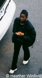 Surya Bonaly hiding a bag of Cheetos behind her back outside by the buses